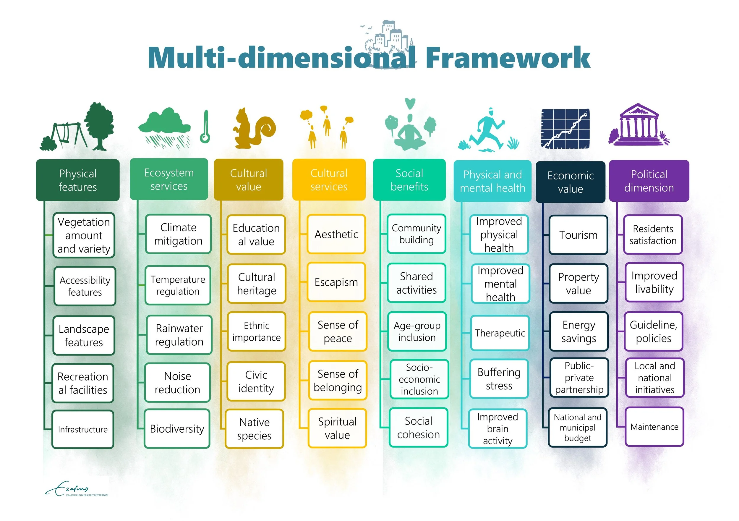 Green cities don't happen by accident – they require collaboration across disciplines and sectors. Architects, urban planners, policymakers, artists, businesses, and community members must work together to integrate greenery into the urban fabric. This can be challenging since we need to navigate multidisciplinary, interdisciplinary, and transdisciplinary collaboration for greener, healthier cities; i.e., we need to engage with many different areas, languages, goals and targets, wants and needs, realistic and prospective solutions. To help stakeholders navigate these challenges, we have designed a booklet and a framework to enhance individual and collaborative solutions. This has been brought about by a plethora of research from different disciplines as well as speaking to city officials. Our framework (Figure 3), in the image above breaks down the true impact of urban greenery across different areas to enable: